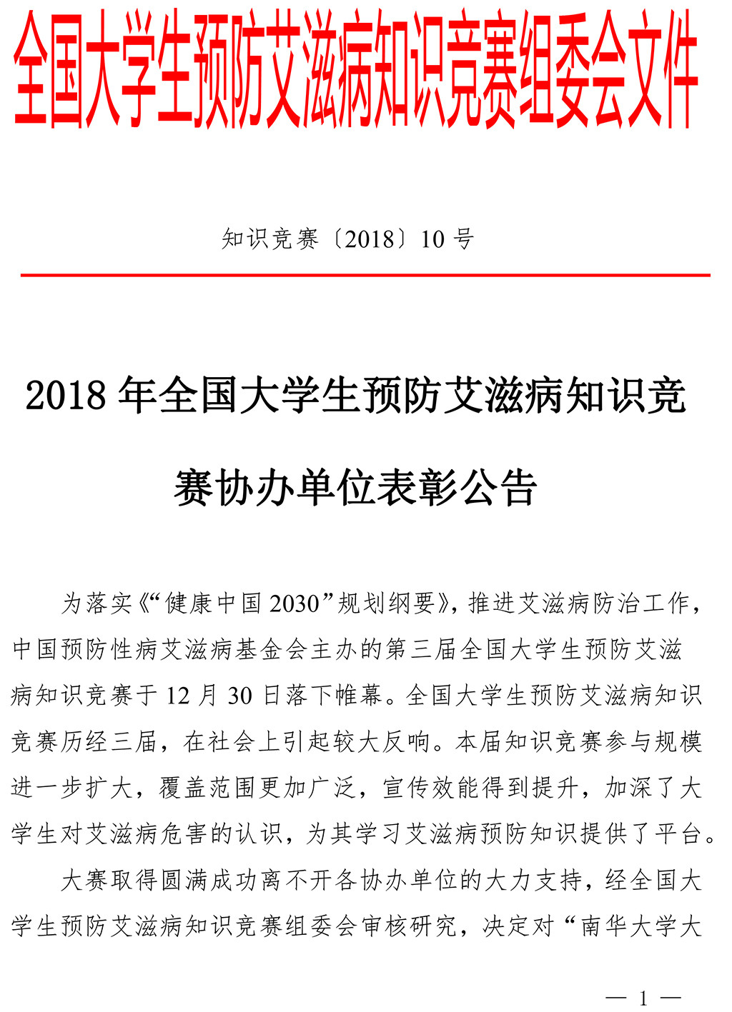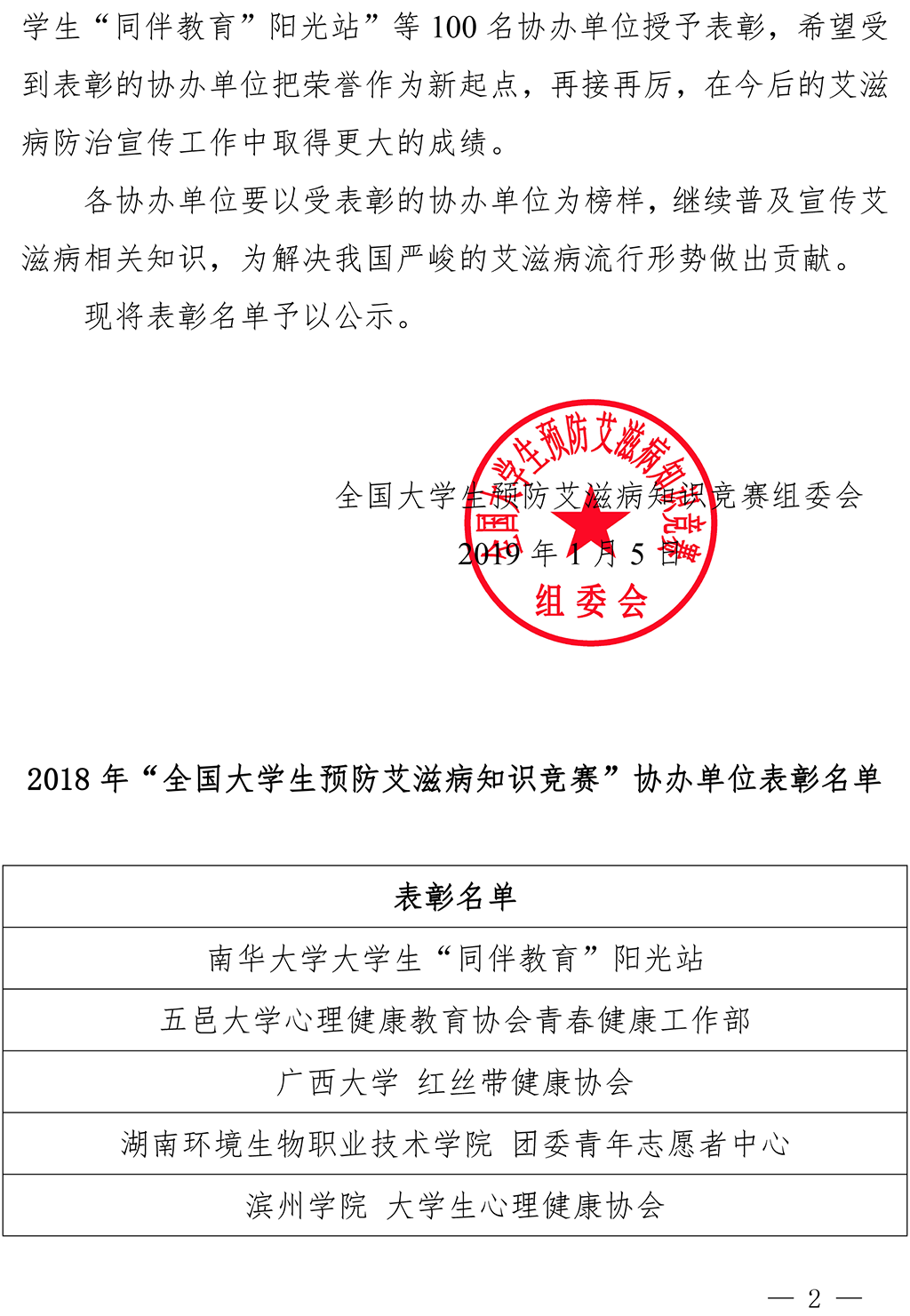 2018年全国大学生预防艾滋病知识竞赛协办单位表彰公告