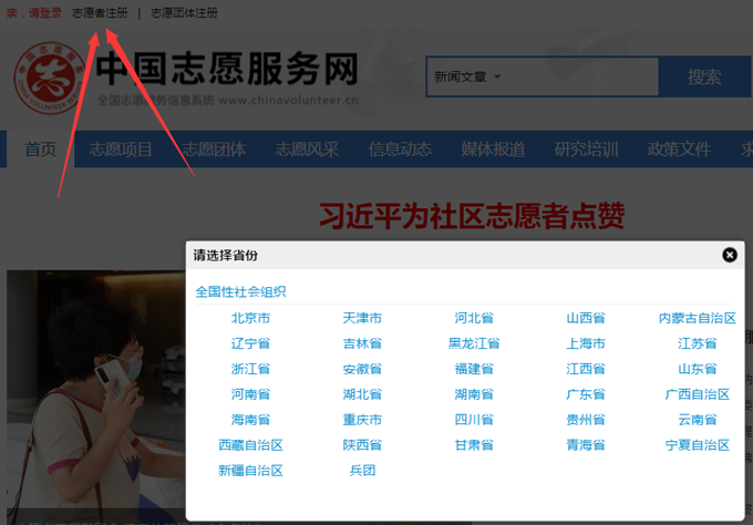 第一步打开全国志愿服务信息系统https://www.chinavolunteer.cn/链接后,点击志愿者注册”,选择学校所在省份进行注册